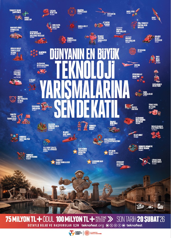 Dünyanın en büyük havacılık, uzay ve teknoloji festivali TEKNOFEST kapsamında düzenlenen 2026 yılı teknoloji yarışmalarına başvurular başladı. Bu yıl yeni adresi Şanlıurfa olan TEKNOFEST, 75 milyon TL ödül ve 100 milyon TL’den fazla maddi desteğiyle genç zihinleri yeni keşiflere davet ediyor. Fikirleri projeye, projeleri geleceğe dönüştürmek isteyenler için yarışma başvuruları ise 20 Şubat’a kadar devam ediyor!